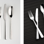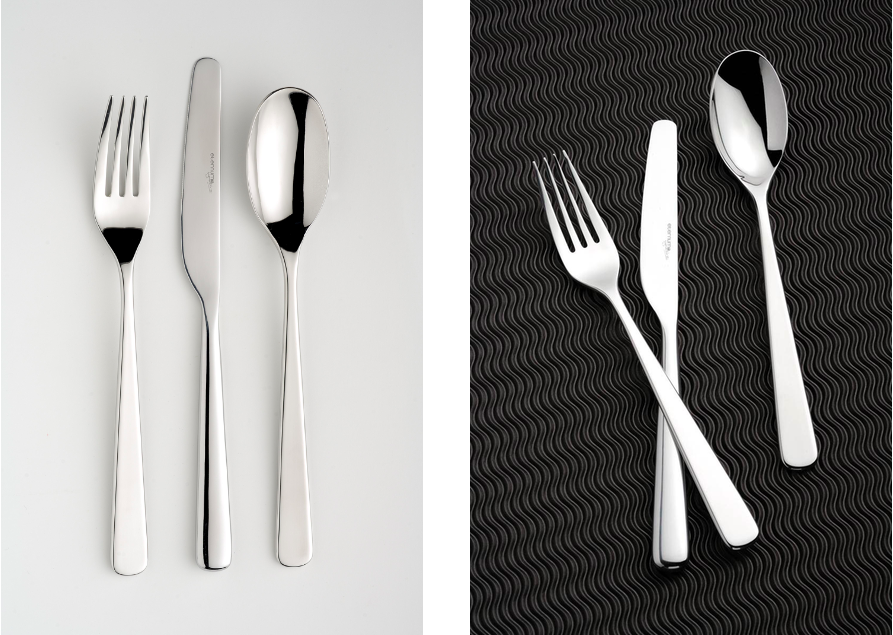 Set of modern 18/10 stainless steel cutlery made using Cromargan protect for a 15 times higher scratch and wear resistance. Matching salad servers.